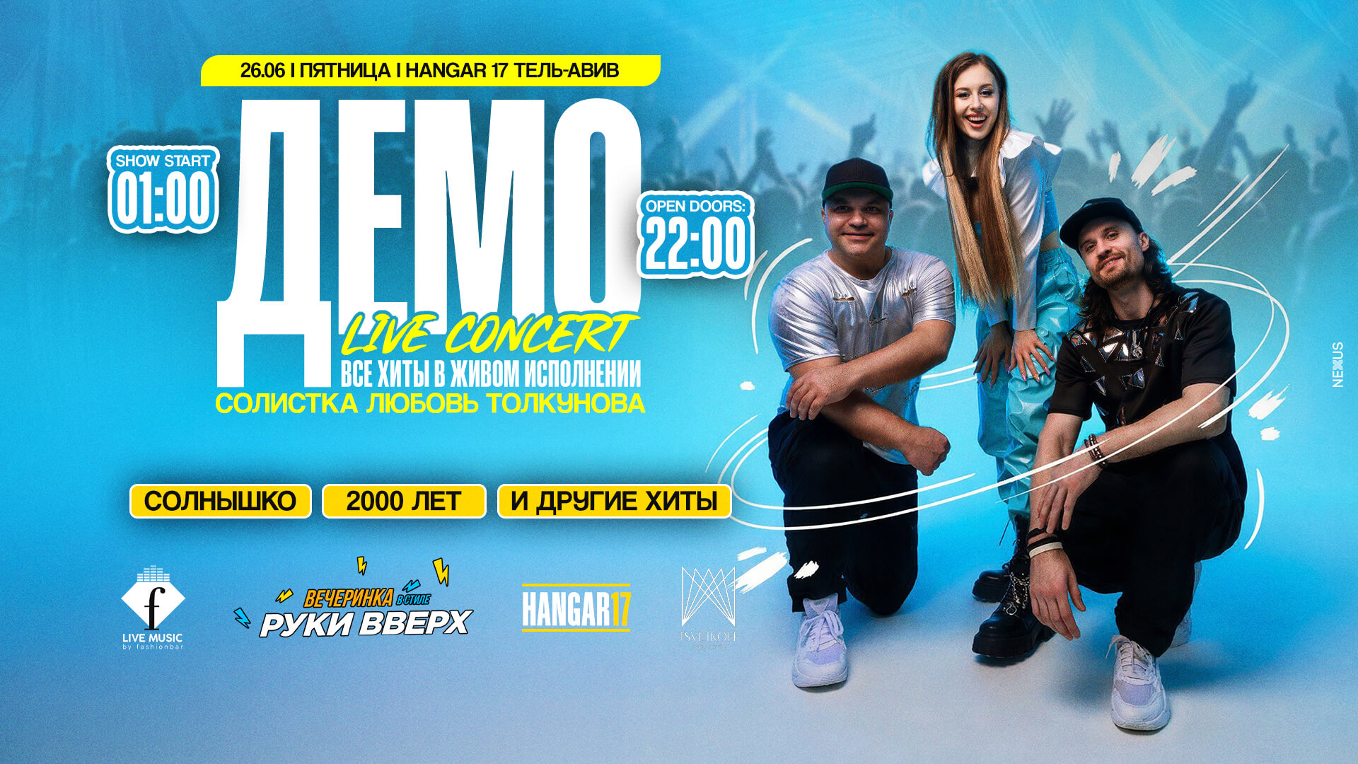 26 июня, в пятницу, легендарная группа Демо с мощным клубным концертом в Hangar 17, Тель-Авив.